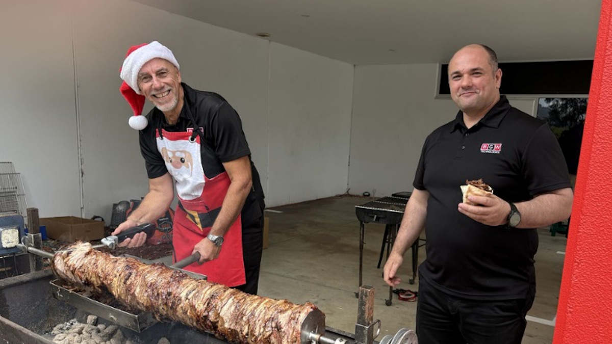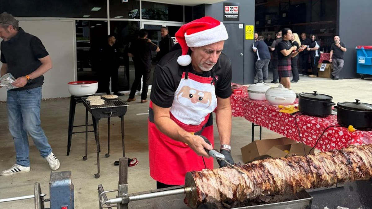 “Thanks to the infamous Louis Mavrelis, Victoria state manager, the mouthwatering gyros did not disappoint,” Meacham said. “A massive 15kg of lamb and 15kg of pork layered alternately on the spit (30kg total), and 10kg of chicken cooked on a separate spit – a whopping 40kg of meat in total kept everyone well-fed throughout the afternoon — an impressive feat in itself.”