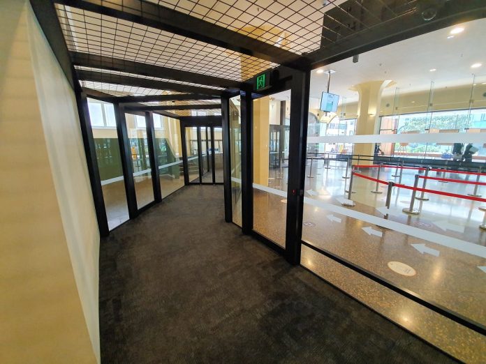 “The function of the tunnel is to prevent persons being able to walk back into the court area after they have exited without moving through the security screening section,” Churchill explains. To physically prevent this, we deployed 3 sets of 4 leaf electric bifold operator doors, which are powder-coated in black.