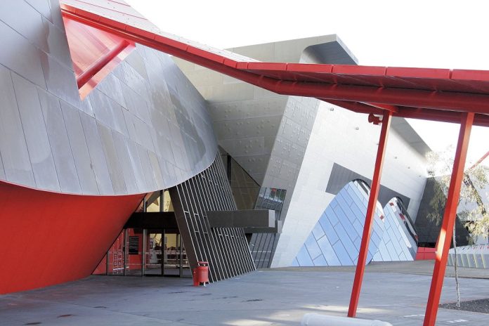 Designed by architect Howard Raggatt (design architect and design director for the project), the museum building is based on a theme of knotted ropes, symbolically bringing together the stories of Australians. The shape of the main entrance hall continues this theme and the entirely non-symmetrical complex is designed to not look like a museum, with startling colours and angles, unusual spaces and unpredictable projections and textures.